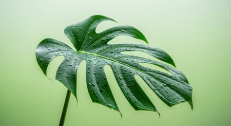 A stunning close-up of a lush monstera leaf adorned with dew drops, set against a soft-focused background. Perfect for nature and decor themes.