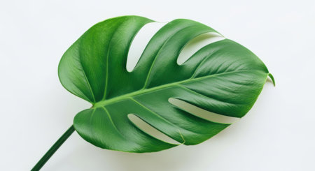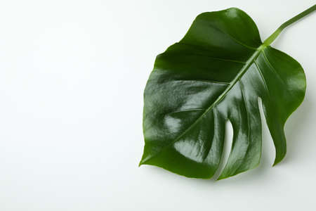 Single leaf of Monstera plant on white background. Copy space.