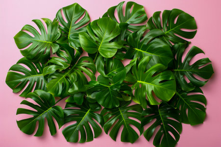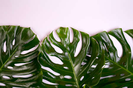 Tropical green monstera leaves are arranged on a pastel pink surface creating a fresh vibrant background for graphic designs or tropical themes.
