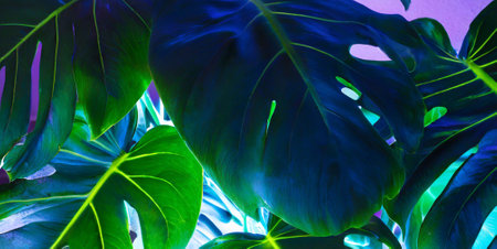 Contemporary night neon lighting and monstera leaves and exotic tropical plants.