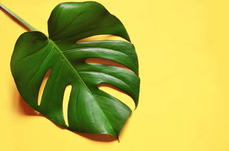 Tropical jungle Monstera leaf isolated on yellow background.