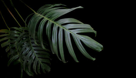 Monstera tropical plant leaf on black background