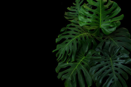 Green leaves of Monstera plant growing in wild, the tropical forest plant, evergreen vine on black background.