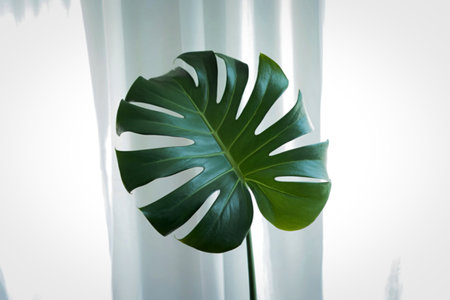 A vibrant green Monstera deliciosa leaf, showcasing its characteristic fenestrations, is positioned against a backdrop of gently draped white curtains, creating a serene and natural aesthetic.