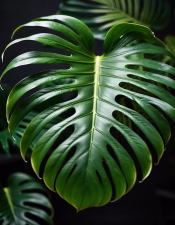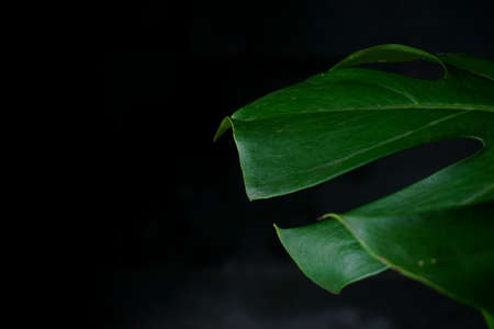 fresh green monstera plant leaf isolated with dark background. tropical summer background. copy space for text advertising