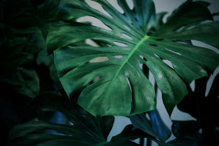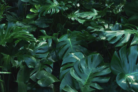 Tropical monstera leaves in dark tone. Nature background.