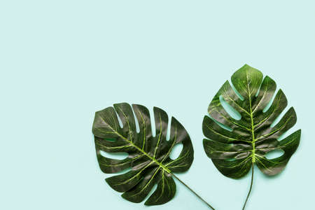 Background Concept. Monstera leave on green background. Top view and copy space