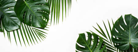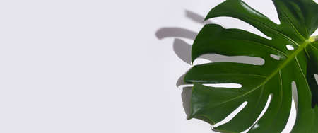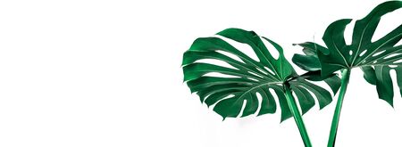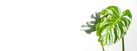 Monstera leaves on white background. Banner image