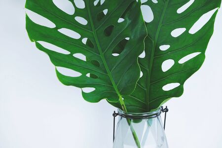 Monstera leaves in glass vase on white background. Tropical leaf design, bright Scandinavian summer composition.