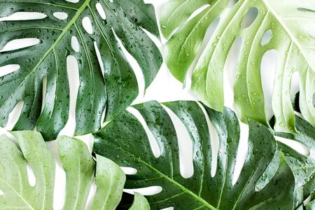 Texture tropical palm leaf Monstera with dew drops on white background. Flat lay, top view