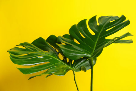 Beautiful monstera leaves on yellow background. tropical plant
