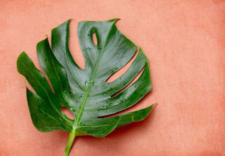 Big fresh Monstera leaf, Swiss cheese plant tropical against coral color background.
