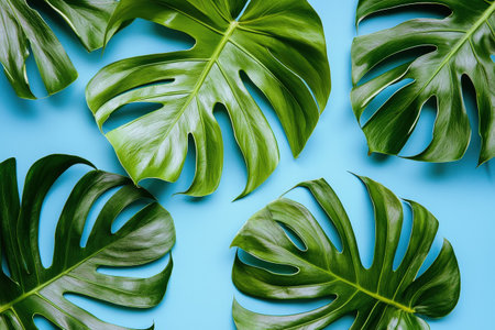 Overhead composition of shiny monstera leaves arranged on a bold blue background. Great for tropical, summer, or botanical-themed content.