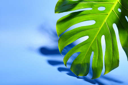 Green tropical monstera leaf on blue background