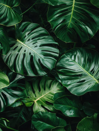 This image showcases a close-up view of vibrant green Monstera leaves with their distinctive patterns. The leaves are textured with a dark green coloration, creating a natural feel. The composition emphasizes the details of the plant life, ideal for various design and decorative purposes.