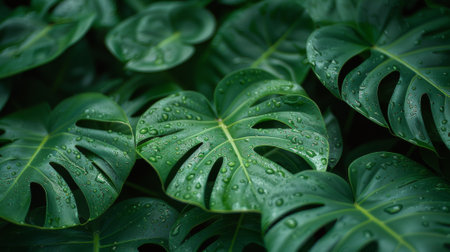 Closeup of Monstera tropical plant leaves with rain drops. Green natural backdrop. Generative AI.