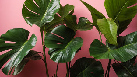 lush green Monstera plants with large, fenestrated leaves set against a pink background.