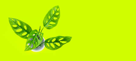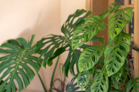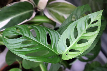 Monstera minimal Monkey Mask closeup. Perforated leaves of home plant Monstera Monkey Mask. Care of tropical home plants, home gardening concept.