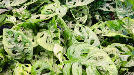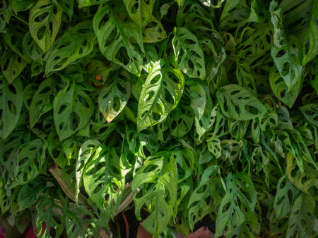 Dense background of vibrant green Monstera adansonii leaves with classic perforated holes