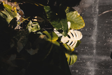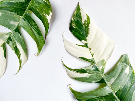Close up of a plant with striking green and white variegated leaves. Trendy tropical houseplant, perfect for modern interiors and botanical design themes.