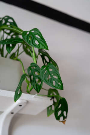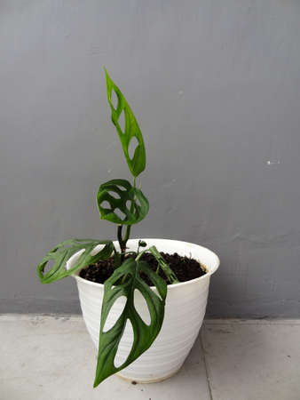 Monstera Adansonii or swiss cheese plants in a white plastic pot. Minimalism indoor plants concept.
