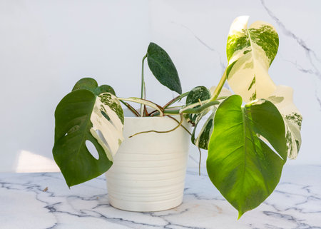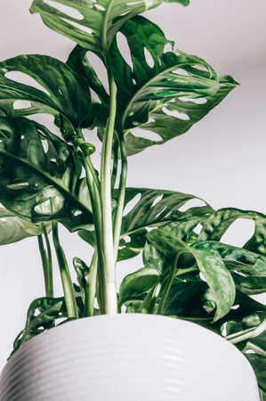Monstera deliciosa minimal Monkey Mask closeup. Monstera Monkey Mask in flower pot on the marble wall. Home gardening, care of plants.
