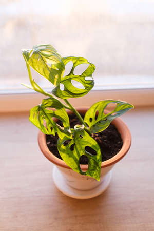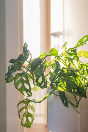 Monstera monkey mask plant in ceramic flower pot illuminated by evening light on the window. Monstera Obliqua or Monstera adansonii. Beautiful vertical poster with liana with carved leaves.