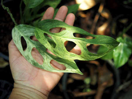 Monstera deliciosa or Swiss cheese plant in hand, stock photo