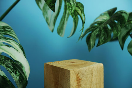 Wooden podium display scene stage showcase front view with copy space and monstera leaves decoration on blue background