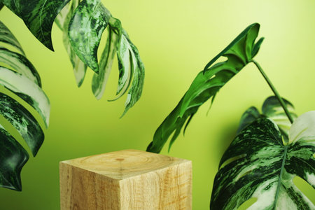 Wooden podium display scene stage showcase front view with copy space and monstera leaves decoration on green background