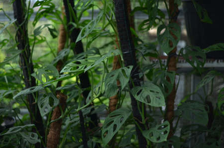 Monstera deliciosa plant growing in a greenhouse. Close-up.