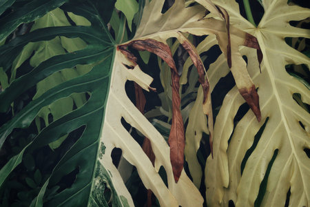 Aging and renewal. Dry and fresh leaves on same Monstera vine