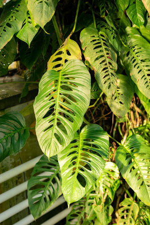 Green Monstera Deliciosa Leaves Known as Swiss Cheese Plant Split Leaf Philodendron in a Tropical Greenhouse