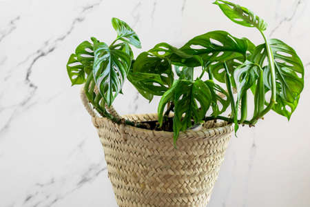 Tropical mini Monstera Monkey Mask potted in wicker straw basket. Monstera Monkey Mask on the marble wall background closeup. Home gardening, care of home plants concept.