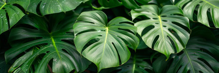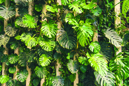 Green leaves of Monstera philodendron, plant growing in botanical garden, tropical forest plants, evergreen vines abstract background.