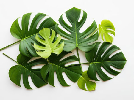 Top view of tropical palm leaves branch and swiss cheese plant isolated on white background with copy space.