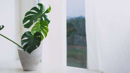 Monstera on pot beside window with curtain, Houseplant trend concept