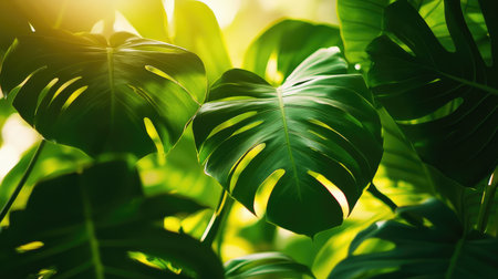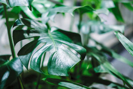 Green leaves of Monstera philodendron plant growing in greenhouse, tropical forest plant