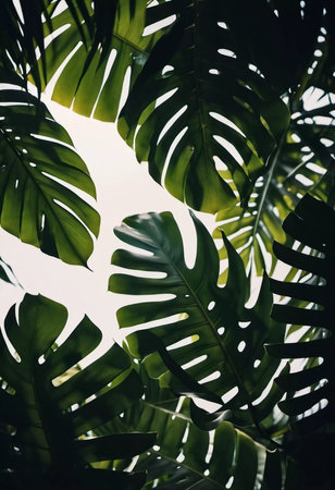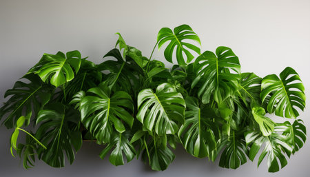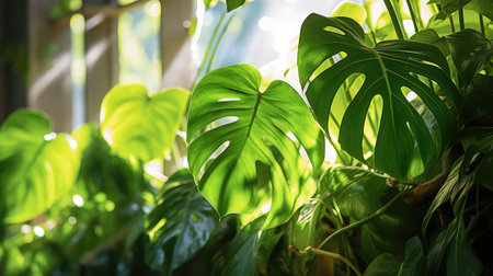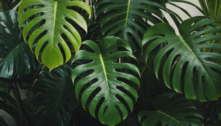 Lush monstera leaves create a vibrant tapestry of green in a peaceful indoor garden setting, showcasing nature's beauty and tranquility amidst urban living.