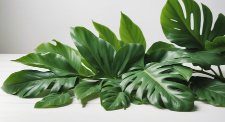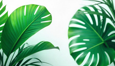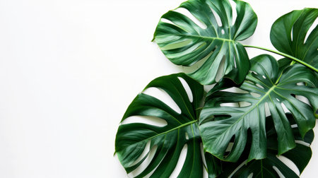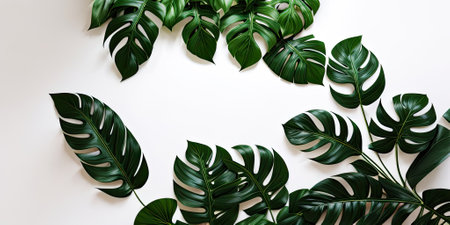Monstera or Palm Leaves Summer Minimal White Background. Space for Text. Copyspace with Tropical Floral. Green Leaf