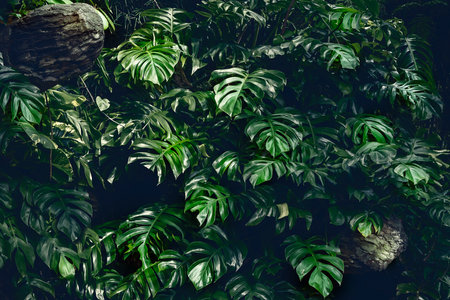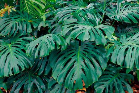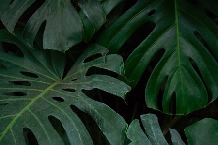 Cheese plant leaves dark background. Natural green background at a botanical garden.