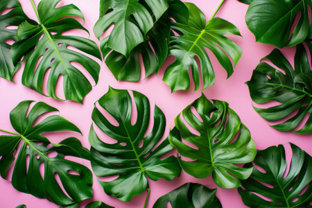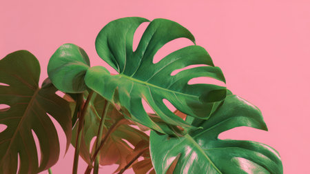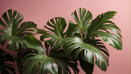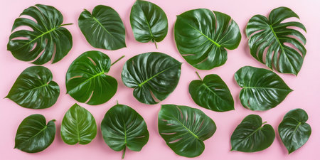 The tropical leaves of Monstera are arranged flatly on a pink background.