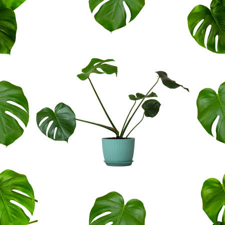 seamless pattern of tropical monstera plant with green leaves in a flower pot isolated on a white background