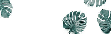 Real monstera leaves set on white background.Tropical,botanical nature concepts ideas.flat lay.long banner