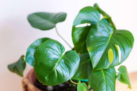 Beautiful monstera deliciosa or Swiss cheese plant in the sun against the background of a white wall. Home gardening concept. Selective focus.