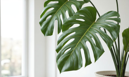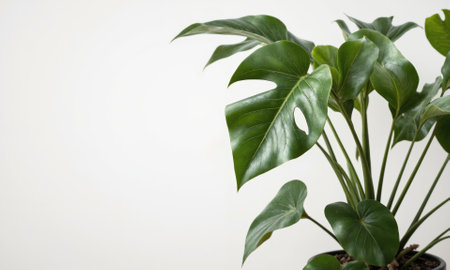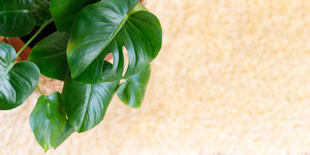 banner Monstera deliciosa or Swiss cheese plant on a white background. Stylish and minimalistic urban jungle interior. Empty white wall and copy space.