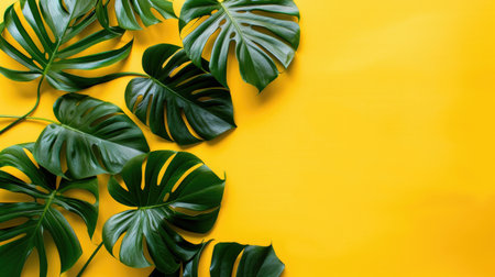 Pattern of tropical monstera leaves on yellow background. Flat lay. Top view. Pop art design, creative and exotic summer concept. Minimal style. Banner