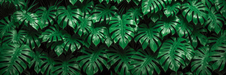 Jungle wall background. Green tropical palm leaves with monstera foliage forest.