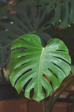 Raindrops on surface of jungle Monster leaf is growing in home gardening area, close up and vertical frame