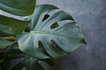 Big leaf of green tropical plant Monstera deliciosa against dark gray copy space wall. Floral home decor and flower shop concept